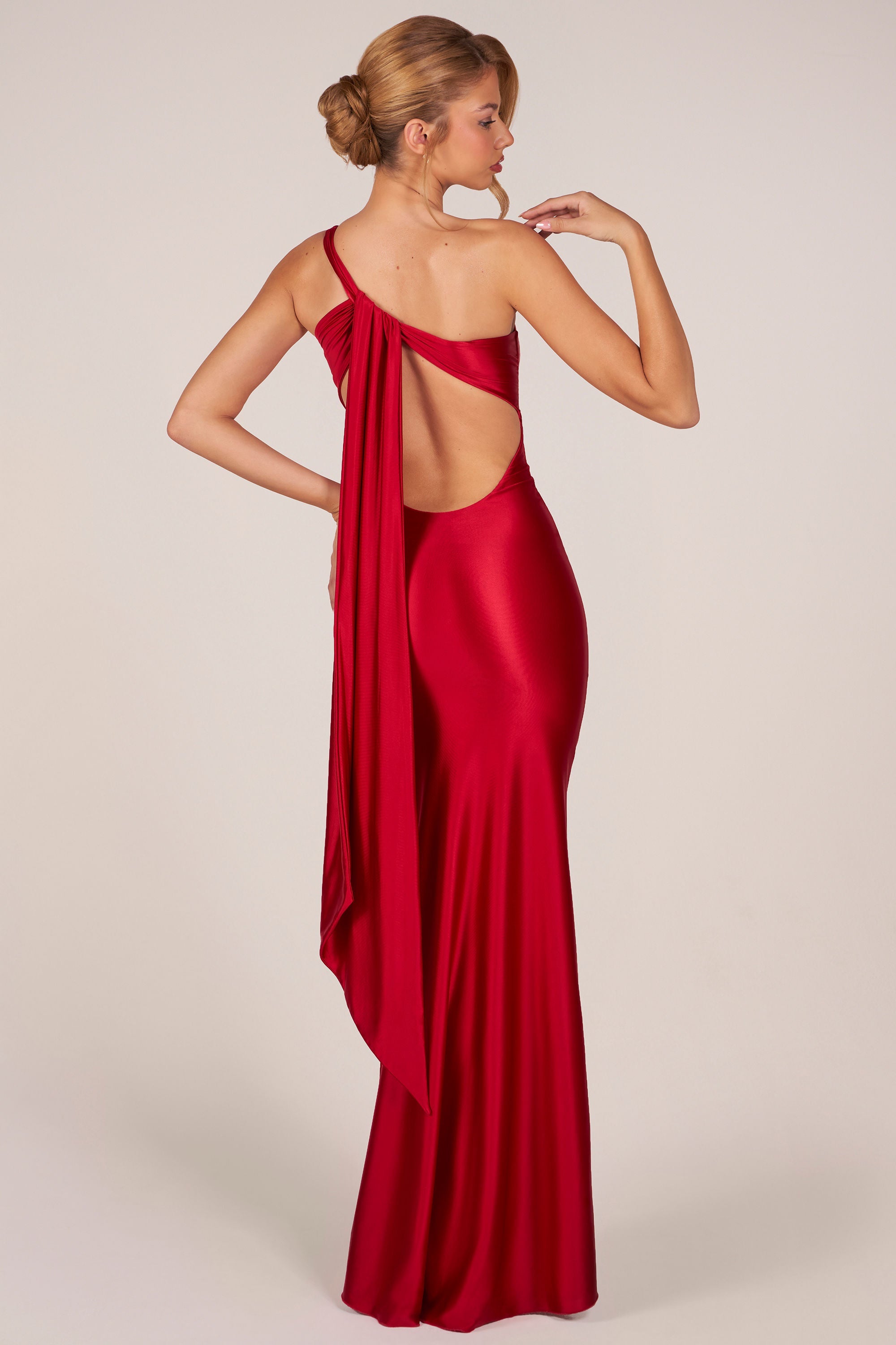 An elegant silhouette designed for statement occasions. Cut to a body-hugging shape, the Adelina asymmetric tie-back gown is crafted from premium shimmering satin jersey that drapes flawlessly over every curve. Framed with a striking one-shoulder neckline, it features a dramatic open back with delicate tie-strap detailing and falls to a sweeping puddle hem for an elevated finish.