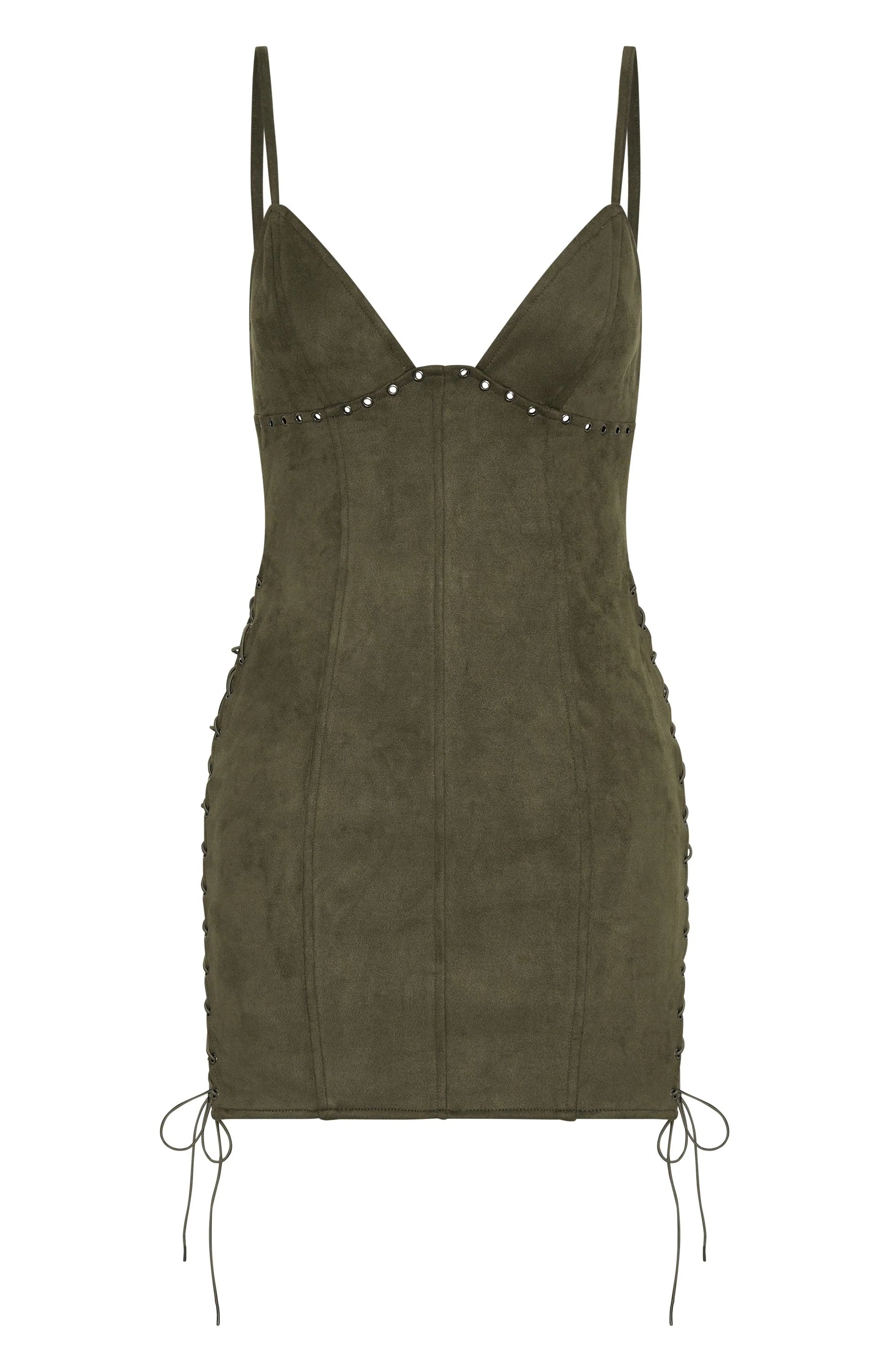 The Bratty Faux Suede Mini Dress Cactus is for the backstage baddies! Features thin, adjustable shoulder straps, V-neckline, faux suede unlined fabric, mini length, studded detailing, side lace up design and invisible back zipper and clasp closure. Add some cowboys boots and gold accessories to make it a stand-out fit!