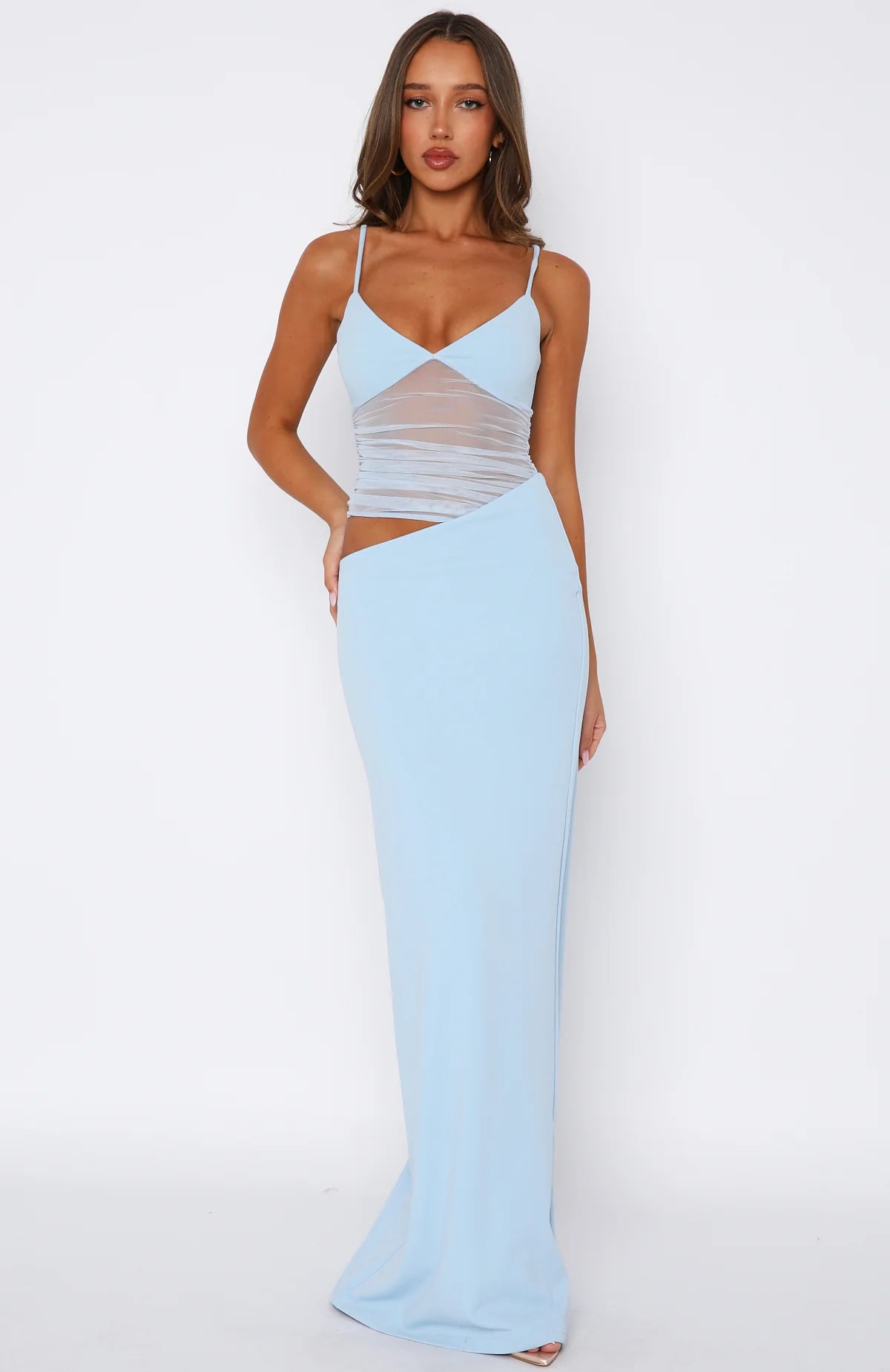 Create a jaw dropping entrance in the Call Me Up Maxi Blue. Features thin adjustable straps, lined bust cups, mesh bodice design, maxi length and side cut out detailing. Pair with a pointed toe heel and mini shoulder bag to have all eyes on you!
