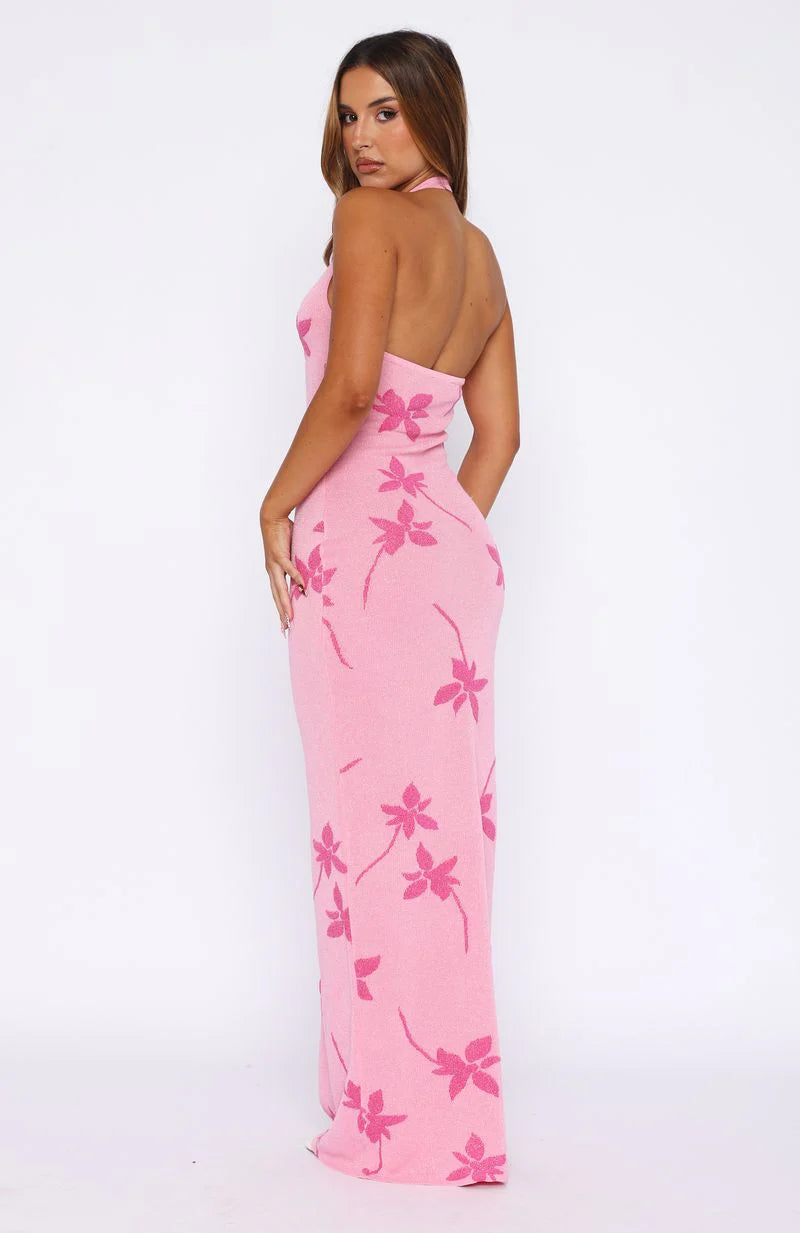 Sunsets and the Chasing Heaven Knit Maxi Dress Pink are a match made in paradise! Features a halter neck design, low plunge neckline, slightly sheer, tinsel embellished for a slight iridescent glow, maxi length, stretch material for an easy slip on design and a figure hugging fit. Complete the look with kitten heels and layered jewellery for a look we love.