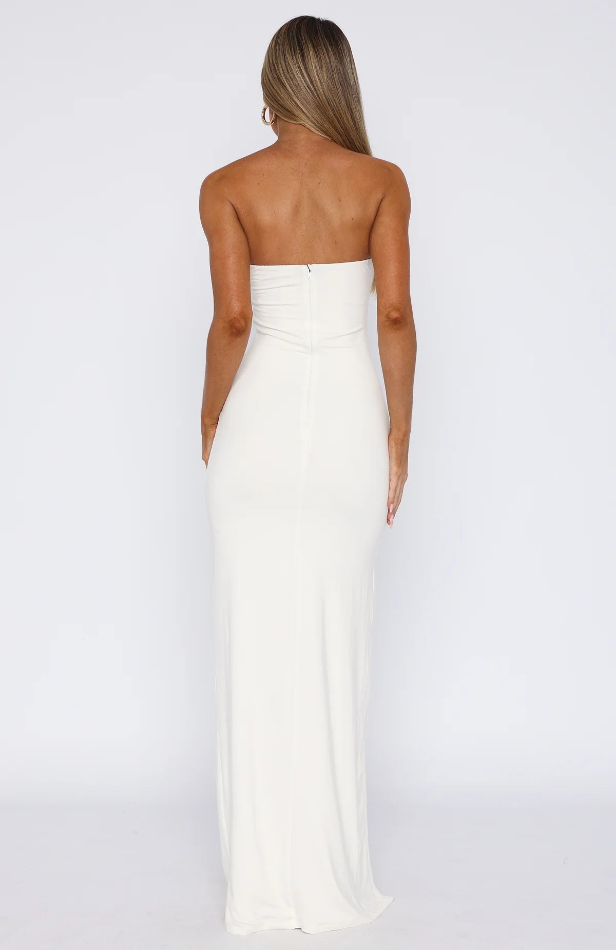 Elegance made comfortable with the Deep In My Heart Strapless Maxi Dress in White! Features strapless neckline with grip tape, fabrication knot detailing on waistband, side leg split and invisible zipper centre back. Complete the look with simplistic heels and gold jewellery for a look we love.
