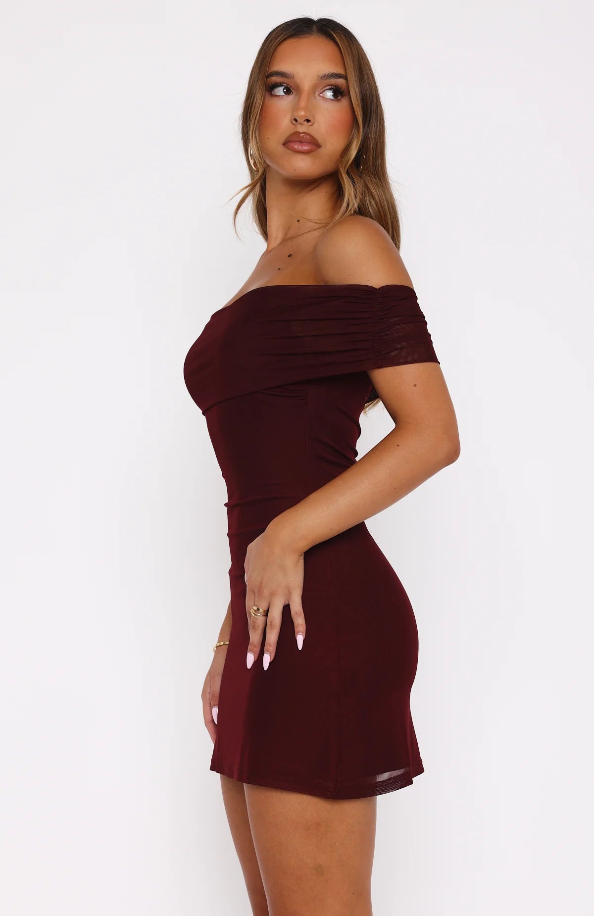 Get romantic in the Got The Talent Off Shoulder Mini Dress Burgundy. Features an off the shoulder design, ruched fabric detail, hugging silhouette, mesh fabric and stretch fabric for an easy slip on design. Pair with a kitten heel, gold accesories and a mini bag for a look we love!