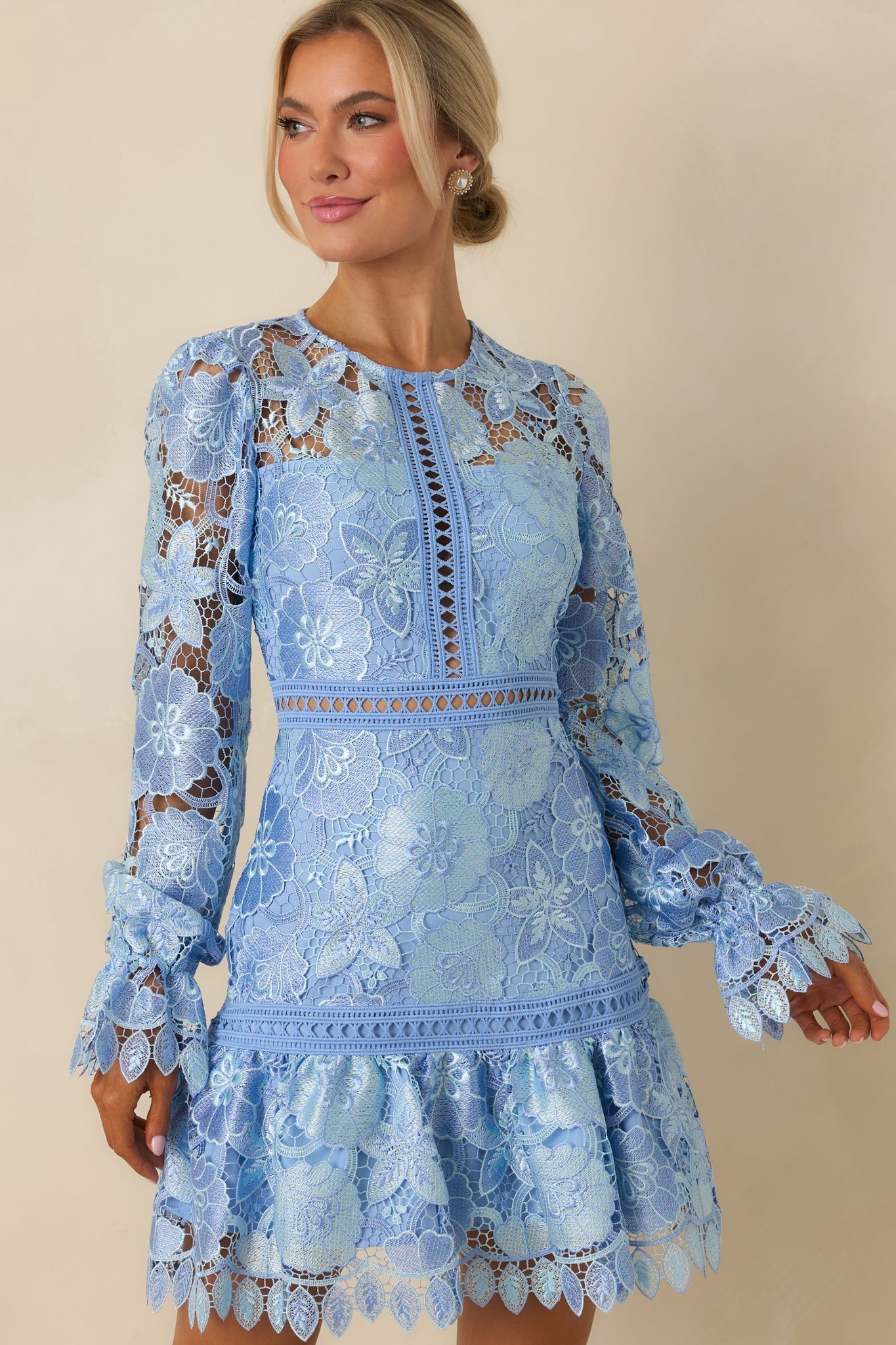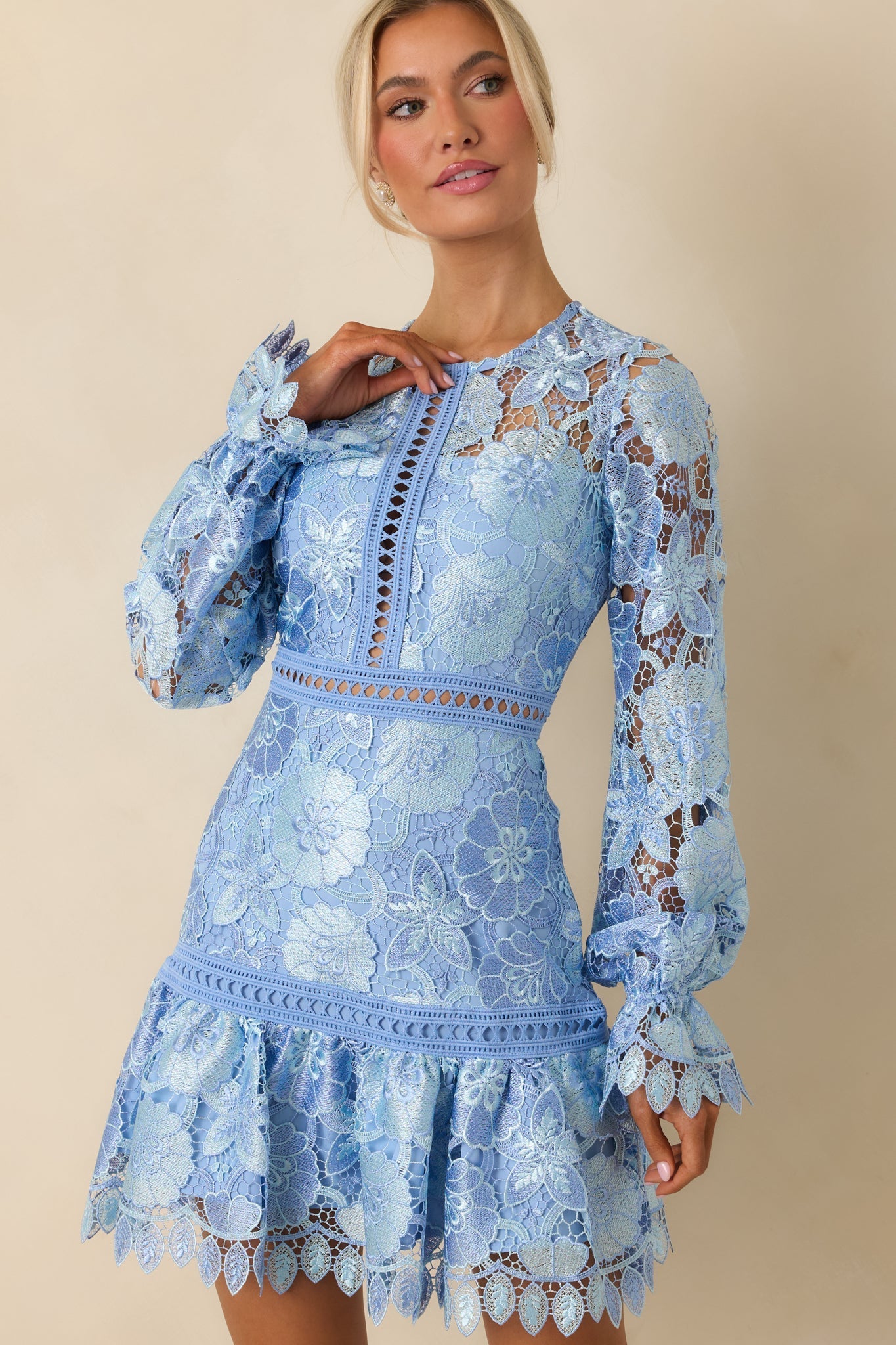 Experience the thrill of authenticity with our Keep It Authentic Light Blue Floral Embroidered Mini Dress! The delicate floral embroidery adds a playful touch to this mini dress while the embroidered overlay allows for breathability. Bring out your inner flower child and stand out in this unique and fun dress. This dress features a crew neckline, transparent detailing, a zipper down the back, a single tier, and elastic cuffed long sleeves.