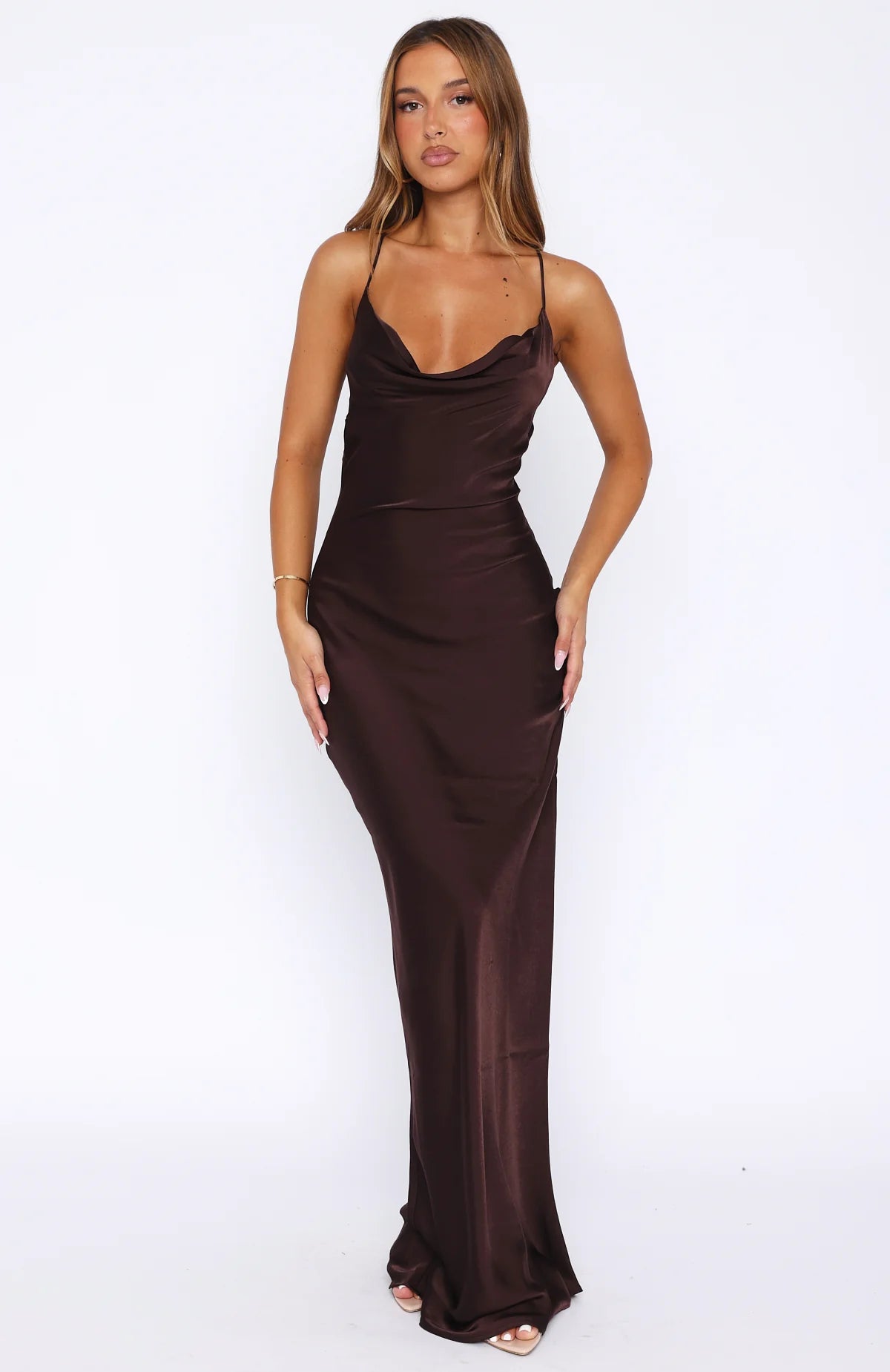 Let your dress do all the talking at your next event. The Over My Head Maxi Dress Chocolate features a plunge neckline, thin straps with adjustable self-tie straps at back, backless, unlined, maxi length and an easy slip-on design. Pair with high shine accessories for the perfect formal look!